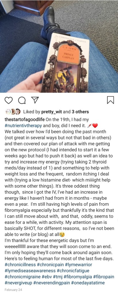 Feb 20 to 24 had more energy than I have in months. Still fibropain and some migraines, as well as fatigue. But the fatigue was minor comparative to normal. Attention span is still shot though and motivation to do any writing/blogging isn’t there.