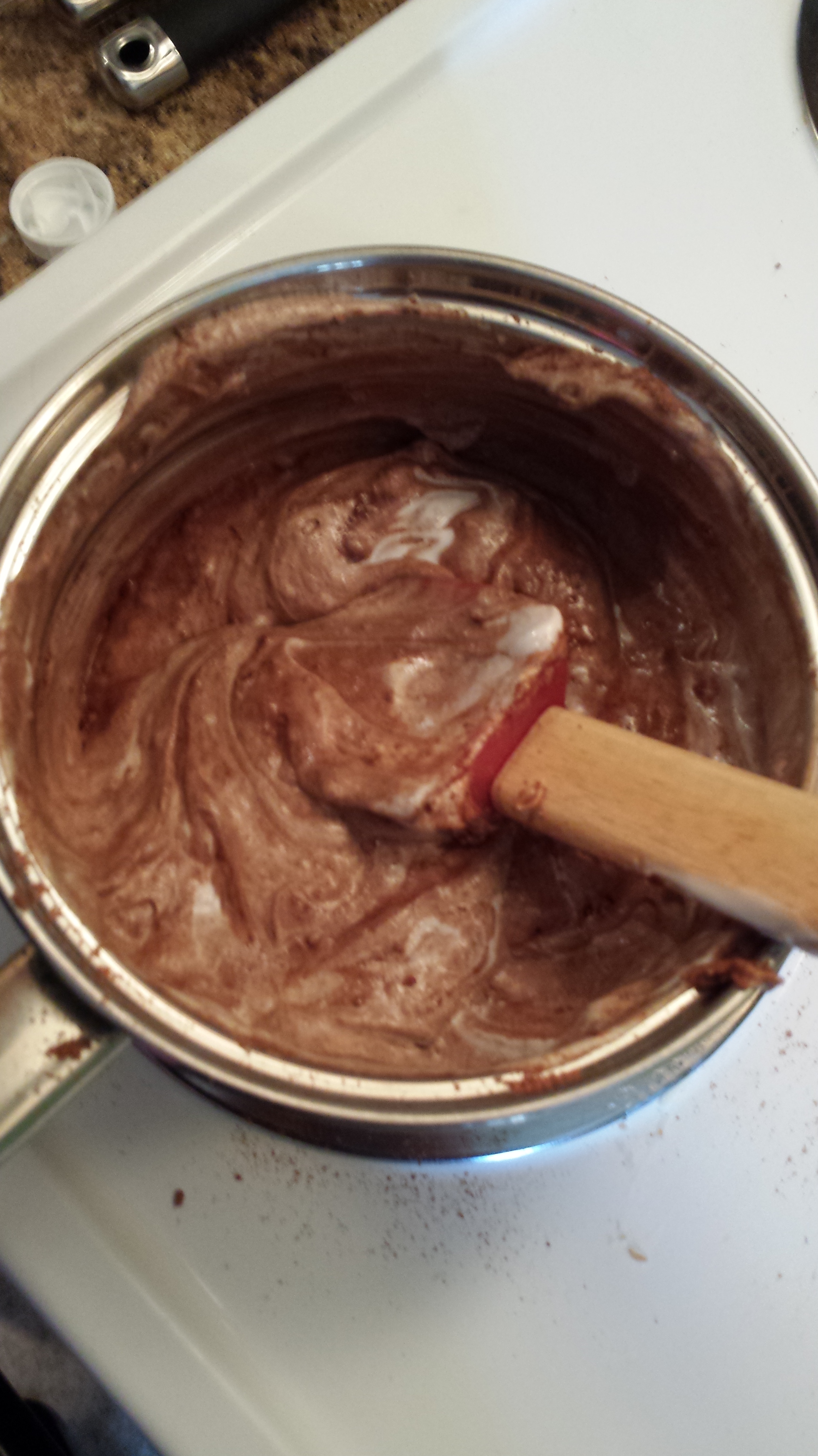 Now, here’s where it got a little iffy. Ganache is a wonderful combination of heavy cream and chocolate. You put it over heat and mix and wait til it’s a beautiful shiny smooth texture. But, now, we can’t have heavy cream and my OH can’t have chocolate. So, since he was home by this time, we worked on it together. And I might get in trouble, but I’ll tell you our secret (just don’t tell him I told you).